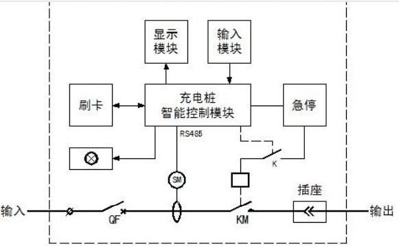 交流充電樁電氣系統(tǒng)如圖 2所示,主回路由輸入保護斷路器、交流智能電能表、交流控制接觸器和充電接口連接器組成;二次回路由控制繼電器、急停按鈕、運行狀態(tài)指示燈、充電樁智能控制器和人機交互設備(顯示、輸入、刷卡)組成。