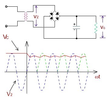 (1)電容濾波,所示在負(fù)載電阻上并聯(lián)了一個(gè)濾波電容C。電容是隔直通交,電壓不能突變。所以只能并聯(lián)在電路中,直流電從負(fù)載過(guò),交流電就從電容過(guò),從而達(dá)到濾波的目的。由于電容的儲(chǔ)能作用,使得輸出波形比較平滑。電容放電的時(shí)間τ=RLC越大,放電過(guò)程越慢,輸出電壓中脈動(dòng) (紋波:是主電流信號(hào)附帶的雜訊成分,小幅度交流電,無(wú)法完全隔絕,一般要求在主電壓的1%內(nèi)即可,如供電12V,那么要求電源的紋波不能大于120毫伏) 成分越少,濾波效果越好(電壓平滑)。